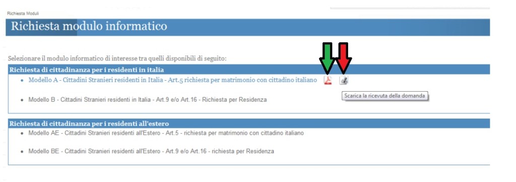 Esci dalla domanda consente di ritornare ai link dei modelli utili per la richiesta della cittadinanza